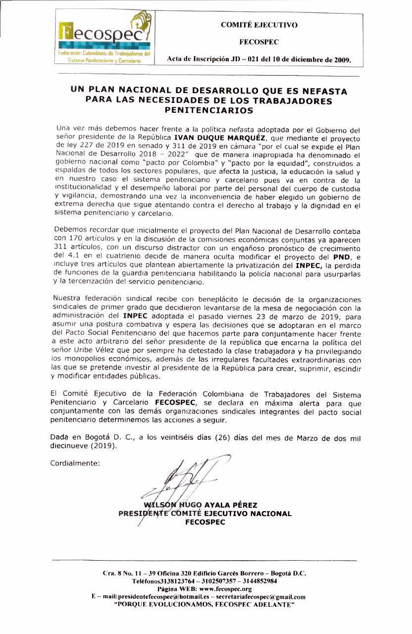 El Presidente Nacional de FECOSPEC Te. Wilson Hugo Ayala Pérez, se pronuncia en nombre de la Federación tras decisiones adoptadas por los representantes del Pacto Social Penitenciario. (Escuchar Audio y Leer Comunicado Abajo)