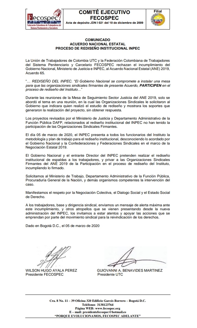La Unión de Trabajadores de Colombia UTC y la Federación Colombiana de Trabajadores del Sistema Penitenciario y Carcelario FECOSPEC rechazan el incumplimiento del Gobierno Nacional, Ministerio de Justicia e INPEC, al Acuerdo Nacional Estatal (ANE) 2019, Acuerdo 65.