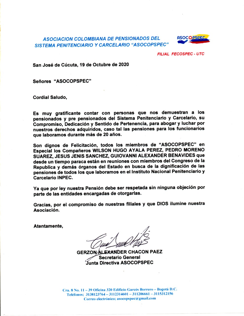 Comunicados Comunicado ASOCOPSPEC resultados en mediación jurídica y acciones legales Por Comunicaciones Fecospec - octubre 26, 2020 0 272 La Secretaría General de ASOCOPSPEC felicita al grupo de profesionales y directivos que han sacado adelante las diferentes acciones legales a favor de la pensión de nuestros compañeros.