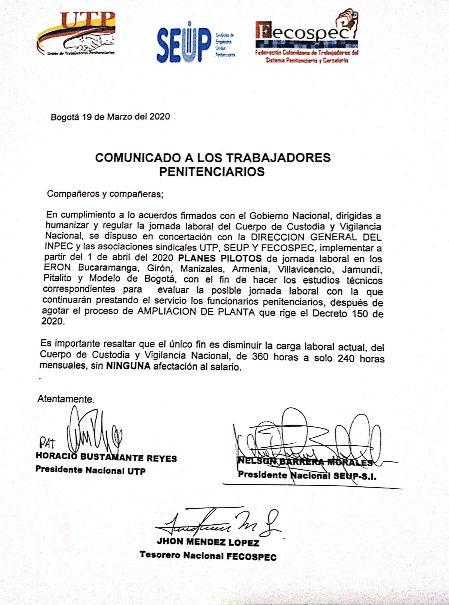 ComunicadosInformaciónInstitucional Comunicado conjunto FECOSPEC, SEUP Y UTP arrancan los planes piloto de regulación jornada laboral Por Comunicaciones Fecospec - marzo 20, 2020 0 965 Concertación con la Dirección Nacional del INPEC el comienzo de los PLANES PILOTO de jornada laboral, con el fin de hacer los estudios técnicos correspondientes.