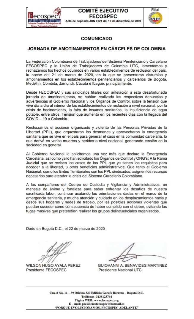 Comunicados Comunicado FECOSPEC – Jornada de Amotinamientos en Cárceles de Colombia Por Comunicaciones Fecospec - marzo 22, 2020 0 441 La Federación de Trabajadores del Sistema Penitenciario y Carcelario FECOSPEC y la Unión de Trabajadores de Colombia UTC, lamentamos y rechazamos los hechos ocurrido en en varios establecimientos de reclusión del país… (Ver comunicado abajo)