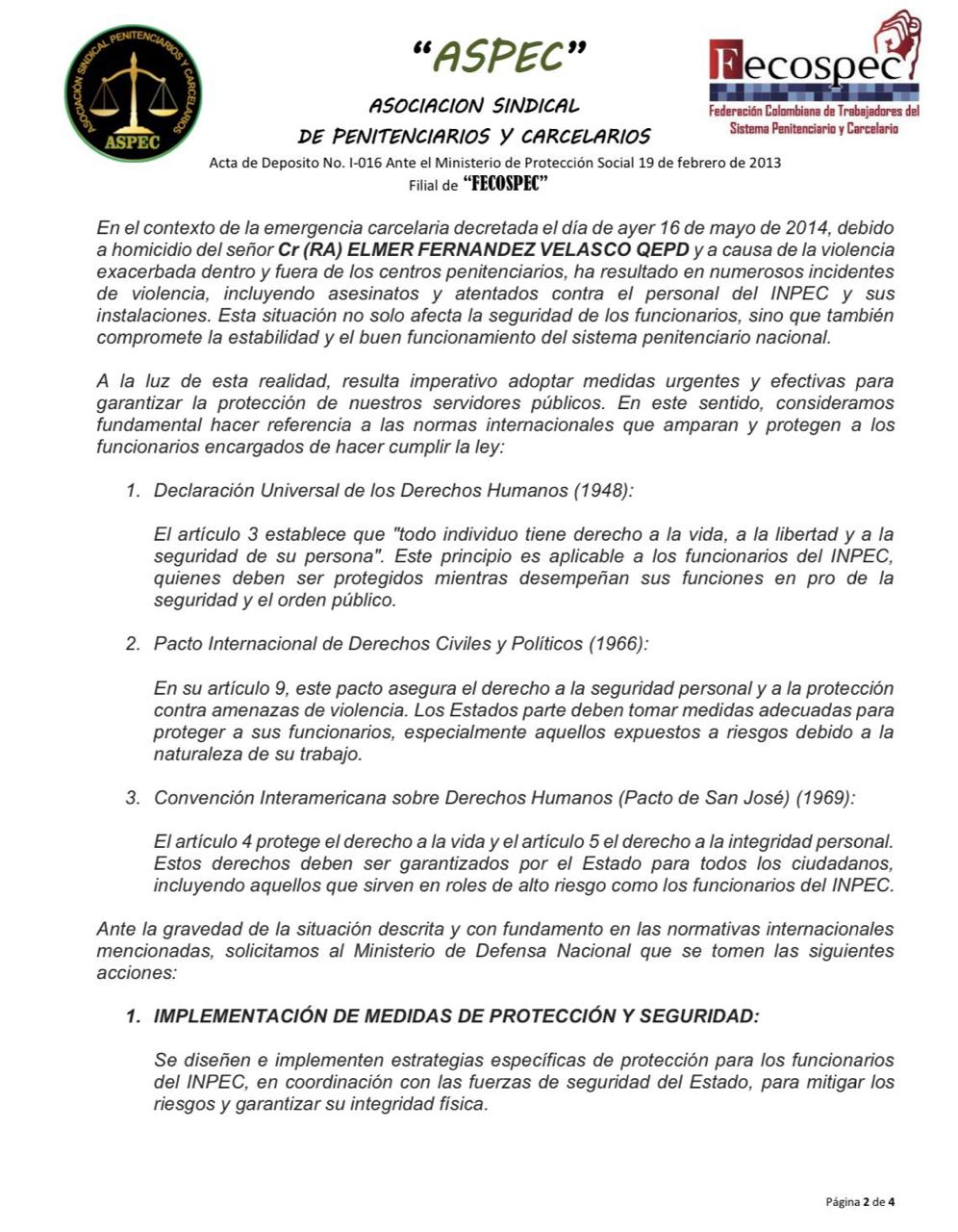 En el contexto de la emergencia carcelaria decretada el día de ayer 16 de mayo de 2014, debido a homicidio del señor Cr (RA) ELMER FERNANDEZ VELASCO QEPD y a causa de la violencia exacerbada dentro y fuera de los centros penitenciarios, ha resultado en numerosos incidentes de violencia, incluyendo asesinatos y atentados contra el personal del INPEC y sus instalaciones. Esta situación no solo afecta la seguridad de los funcionarios, sino que también compromete la estabilidad y el buen funcionamiento del sistema penitenciario nacional. (ver abajo)