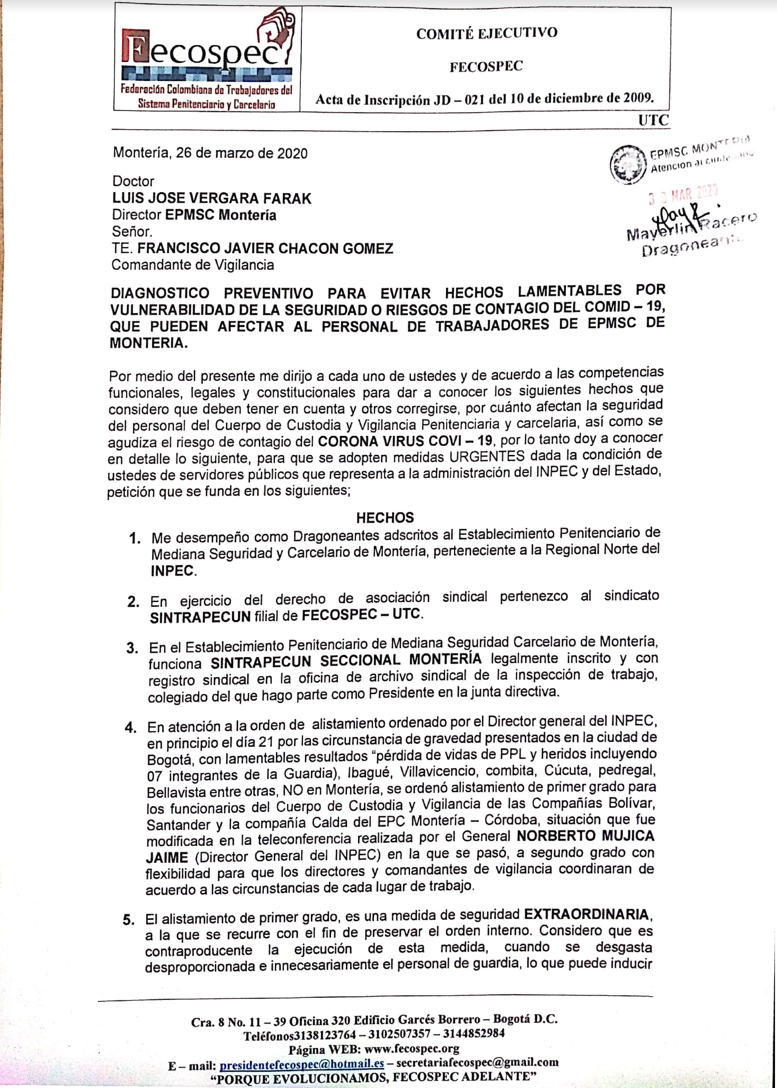 InformaciónDocumentos Diagnóstico realidad frente a la pandemia y órden público EPMSC Montería Por Comunicaciones Fecospec - abril 3, 2020 0 332 FacebookTwitterPinterestWhatsApp Integrante del Comité Ejecutivo FECOSPEC a a conocer algunos hechos importantes a tener en cuenta, con el objeto de que se adopten medidas urgentes en el establecimiento.