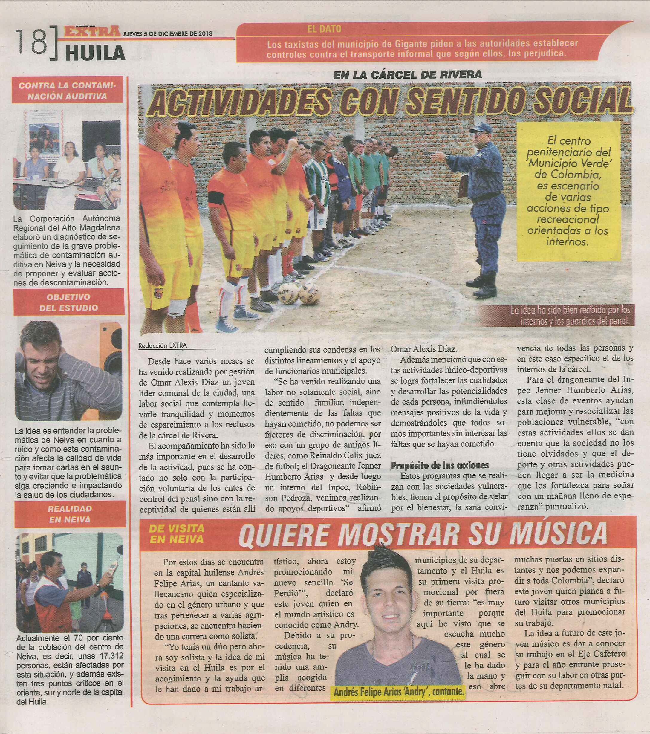 En un verdadero ejemplo se ha convertido la gestión que realizan nuestros compañeros de SINTRAPEC en el Huila, a tal punto que los medios de comunicación registran el proceso de resocialización del ser humano que lidera el dragoneante Jenner Arias a quien desde la distancia felicitamos y deseamos muchas bendiciones en su tarea.