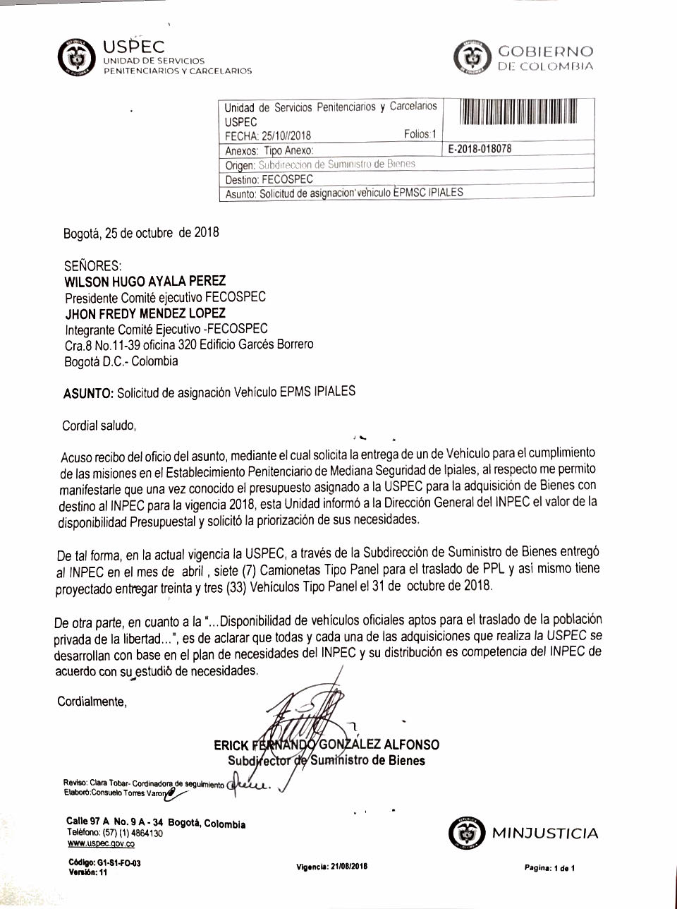 InformaciónDocumentosInstitucional En 2018 la USPEC ha suministrado 40 camionetas tipo panel Por Comunicaciones Fecospec - noviembre 4, 2018 0 882 Así lo manifestó la entidad dando cuenta de la gran entrega de 33 vehículos el día 31 de Octubre, respecto de la solicitud del vehículo para el EPMSC Ipiales.