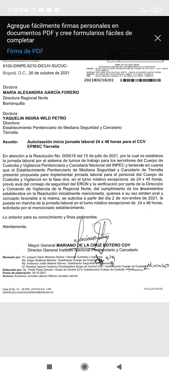 InformaciónInstitucional EPMSC Tierralta inicia jornada laboral 24×48 Por Comunicaciones Fecospec - noviembre 2, 2021 0 204 Foto: Complejo Tierralta A partir del 02 de noviembre de 2021 el EPMSC es autorizado para iniciar jornada laboral 24×48 según lo manifestado en oficio adjunto.(VerDocumentoAbajo)