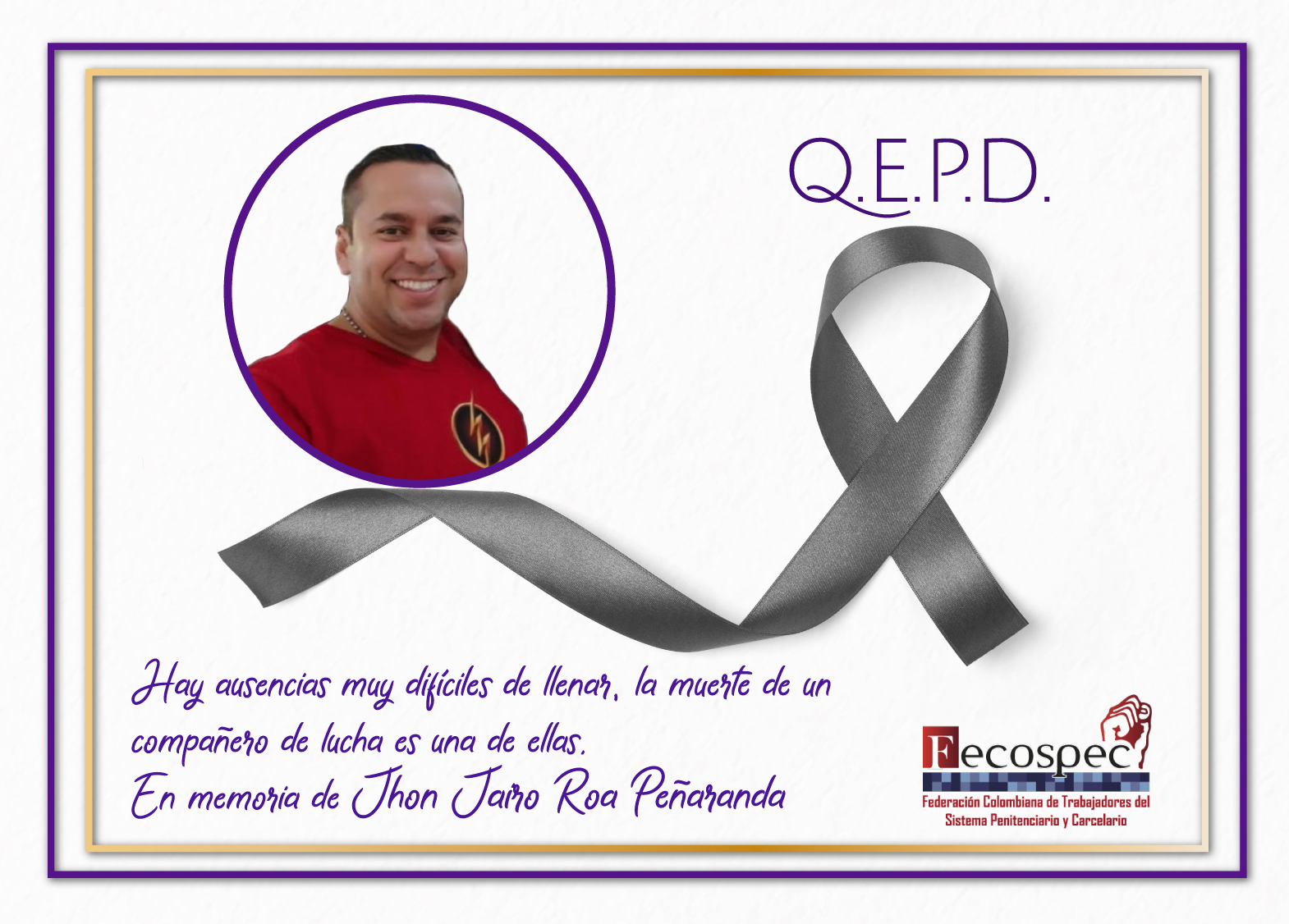 Nuestras condolencias sentidas a los familiares y amigos del compañero Jhon Jairo Roa Peñaranda, gran amigo y dirigente sindical, pensionado hacía apenas una semana y quien nos abandona siendo una víctima más de una situación que no debiera ser.