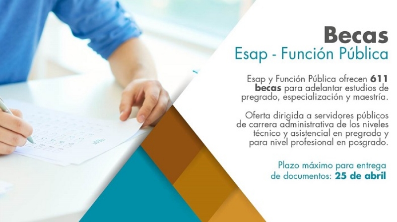 Función Pública y la Escuela Superior de Administración Pública, ESAP dan a conocer a los servidores públicos de carrera administrativa de los niveles técnico, asistencial y profesional, una oferta educativa que consta de 611 becas para adelantar estudios de administración pública en la modalidad de pregrado, especialización y maestría, que estará abierta hasta el martes 25 de abril de 2017 a las 11:59 p.m. Consulte más información en en este enlace.