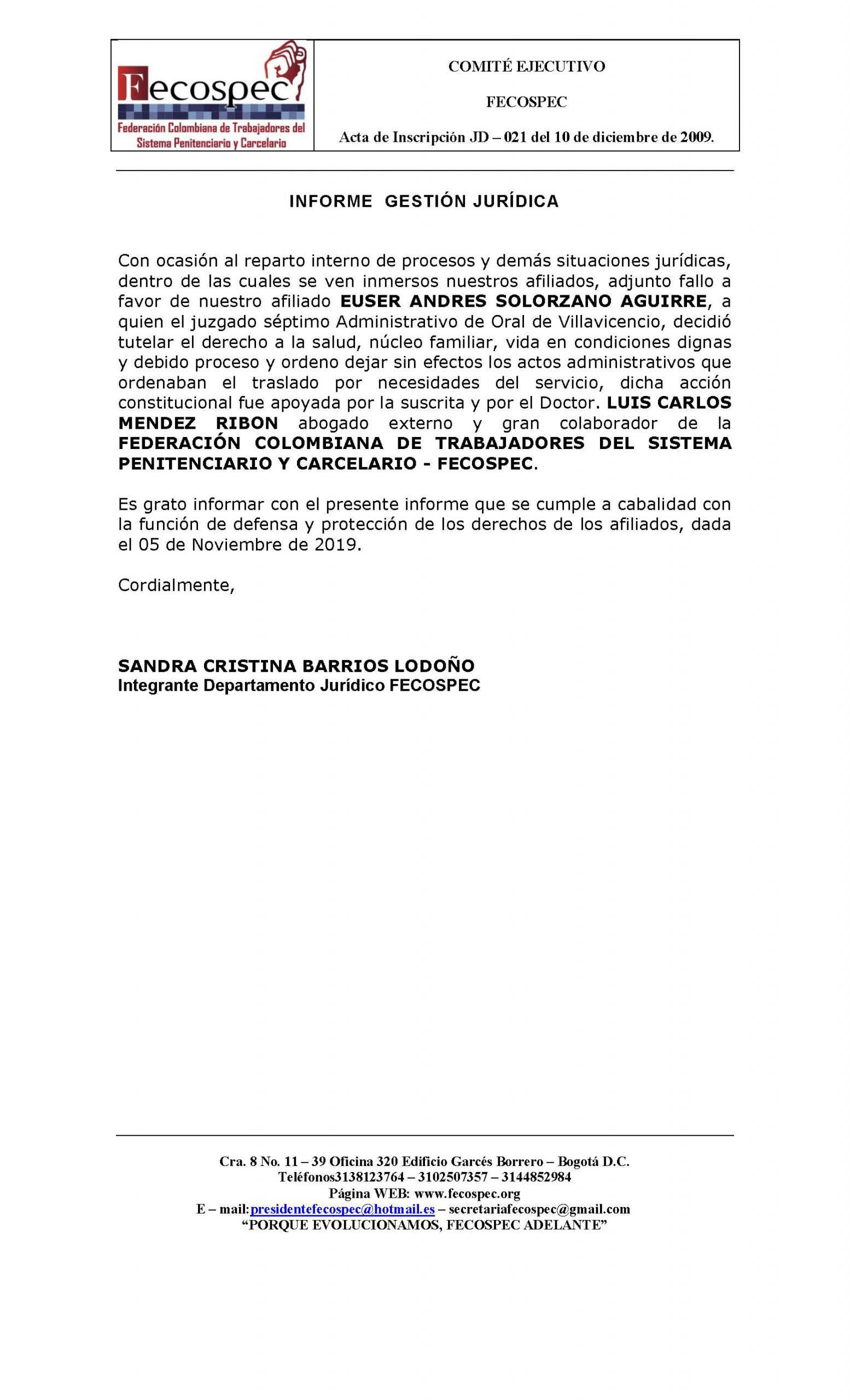 Con el apoyo jurídico de FECOSPEC, un fallo de tutela suspende resolución de traslado para un funcionario, por considerar vulnerados sus derechos a la salud, núcleo familiar, vida en condiciones dignas y debido proceso. (ver fallo más abajo)