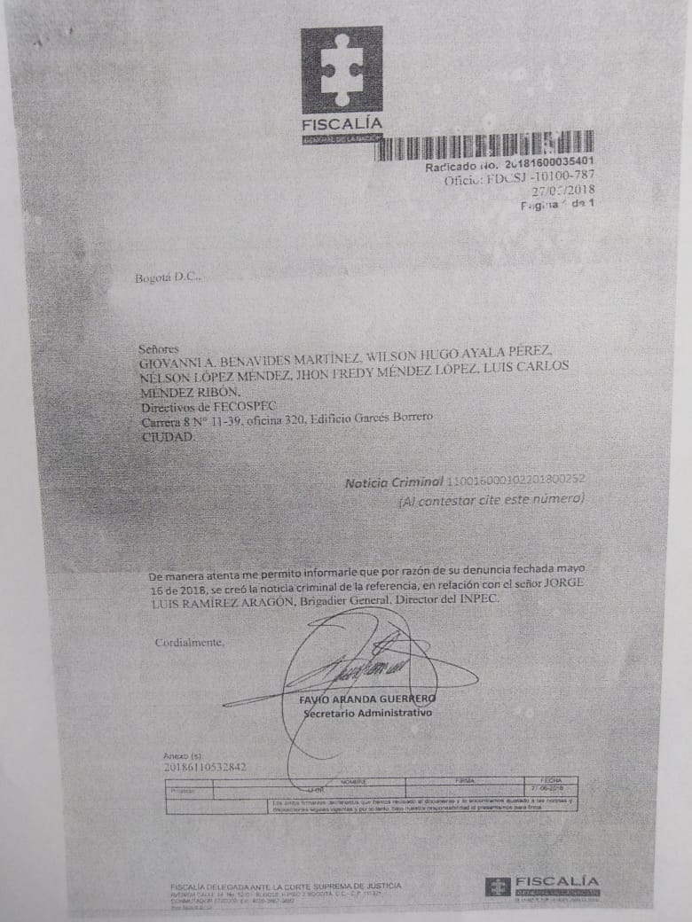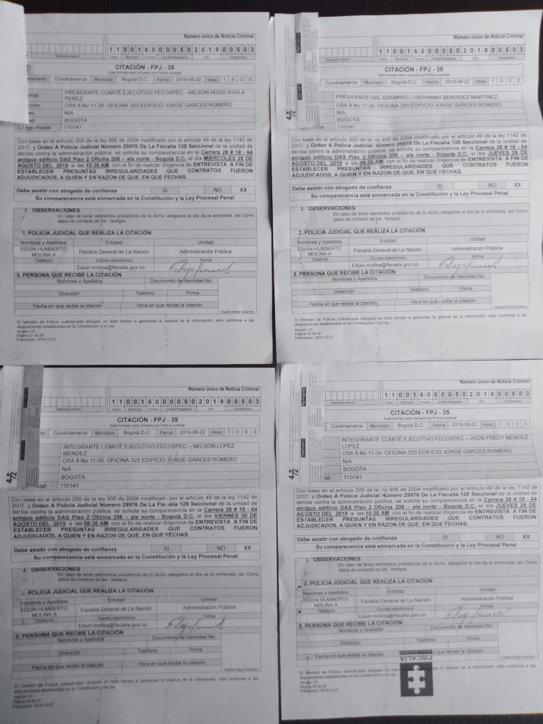 Fiscalía General de la Nación libra citaciones a Directivos de Fecospec, avanzando en el caso de las denuncias por presuntas irregularidades en convenios interadministrativos entre el INPEC y algunas Alcaldías. (Ver documentos abajo)