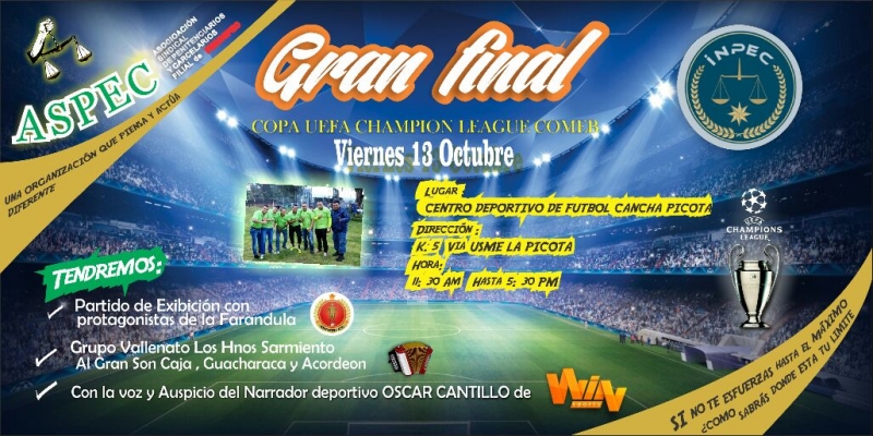 Uncategorized Gran Final Copa Champions League COMEB – EVENTO DEPORTIVO » LA PICOTA « Por Comunicaciones Fecospec - octubre 13, 2017 0 268 Desde las 11:30 am hasta las 5:30 pm. Con la presencia de OSCAR CÁNTILLO, narrador de Win Sports.