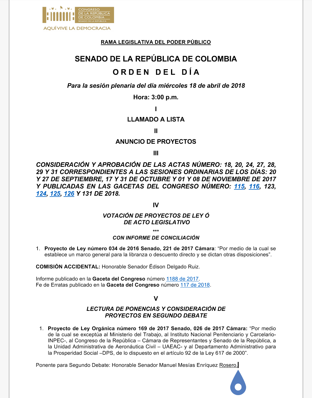 Como segundo en el orden del día se encuentra programado el debate del Proyecto de Ley Orgánica número 169 de 2017 Senado, 026 de 2017.