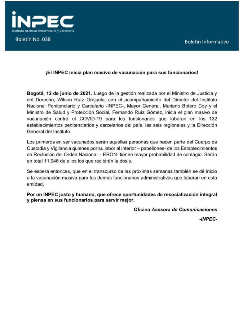 InformaciónInstitucional INPEC inicia Plan Masivo de Vacunación para sus funcionarios Por Comunicaciones Fecospec - junio 12, 2021 0 205 FacebookTwitterPinterestWhatsApp Se inicia el plan de vacunación para todos los funcionarios de Cuerpo de Custodia y Vigilancia.