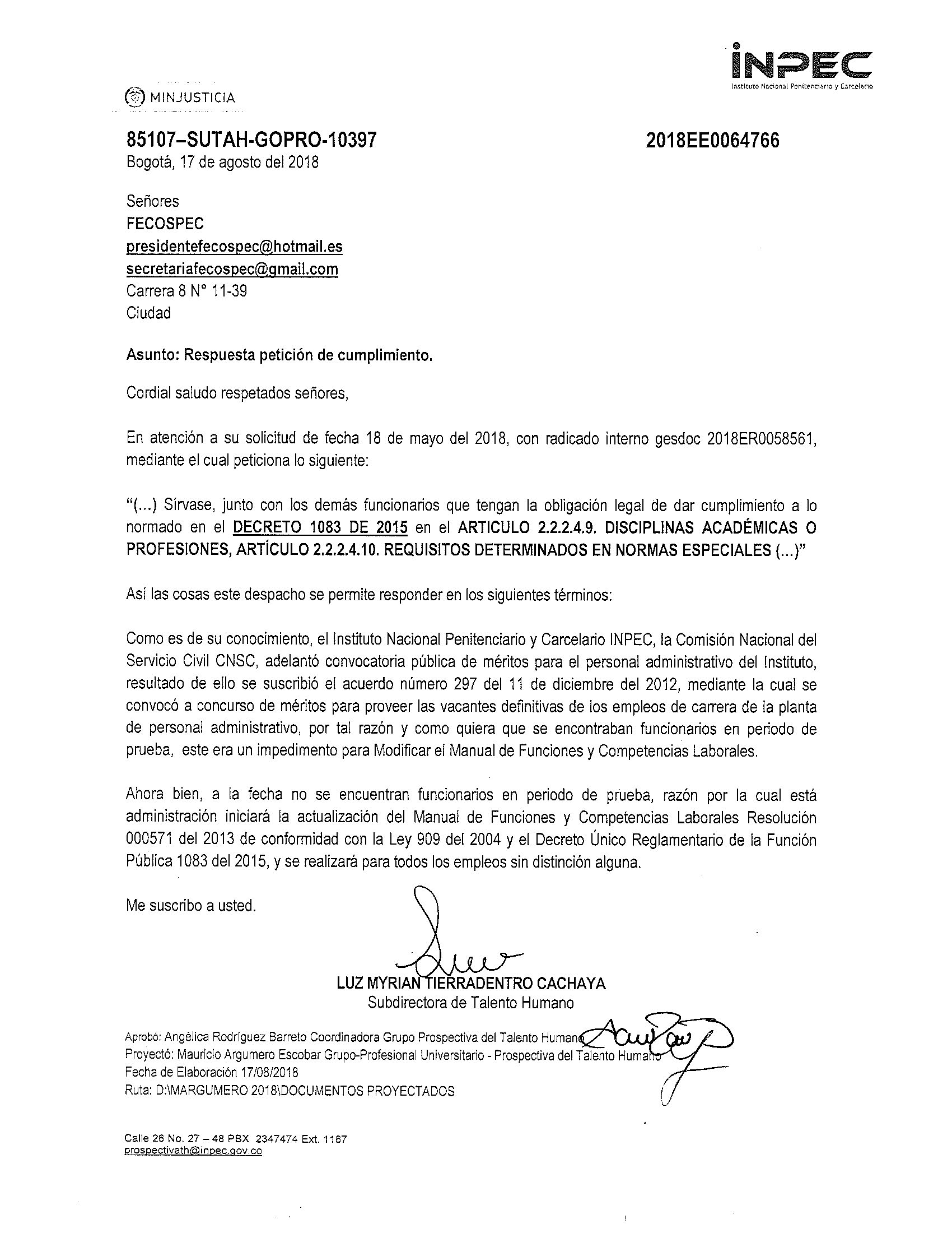 InformaciónInstitucional INPEC iniciará la actualización del Manual de Funciones y Competencias Laborales Por Comunicaciones Fecospec - agosto 23, 2018 0 2636 En respuesta a la acción de cumplimiento elevada por FECOSPEC respecto del cumplimiento del Decreto 1083 de 2015, el INPEC indica que iniciará la actualización del Manual de Funciones para todos los empleos sin distinción alguna.