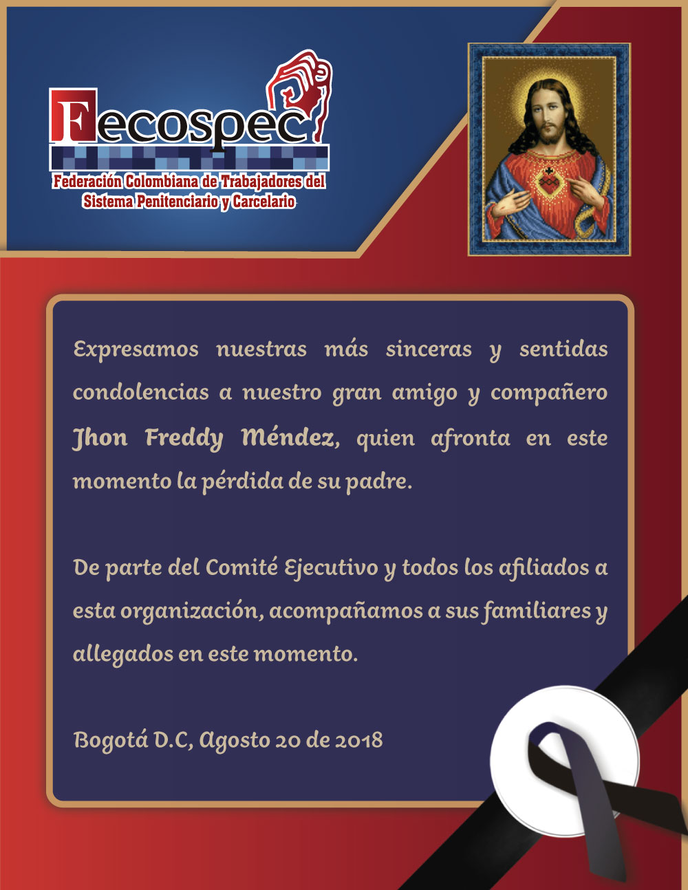 Comunicados Mensaje de condolencia a nuestro compañero John Méndez Por Comunicaciones Fecospec - agosto 21, 2018 0 530
