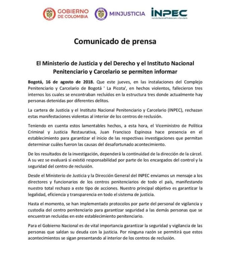 “Enviamos un mensaje a los directores y funcionarios de los centros penitenciarios de todo el país, manifestando nuestro total rechazo a este tipo de acciones (…) Por ninguna razón se permitirá que estos acontecimientos se sigan presentando al interior de los centros de reclusión”, agregó el Gobierno Nacional, al precisar que se han implementado protocolos por parte del personal de vigilancia y custodia del centro penitenciario para garantizar seguridad a las demás personas que se encuentran recluidas.