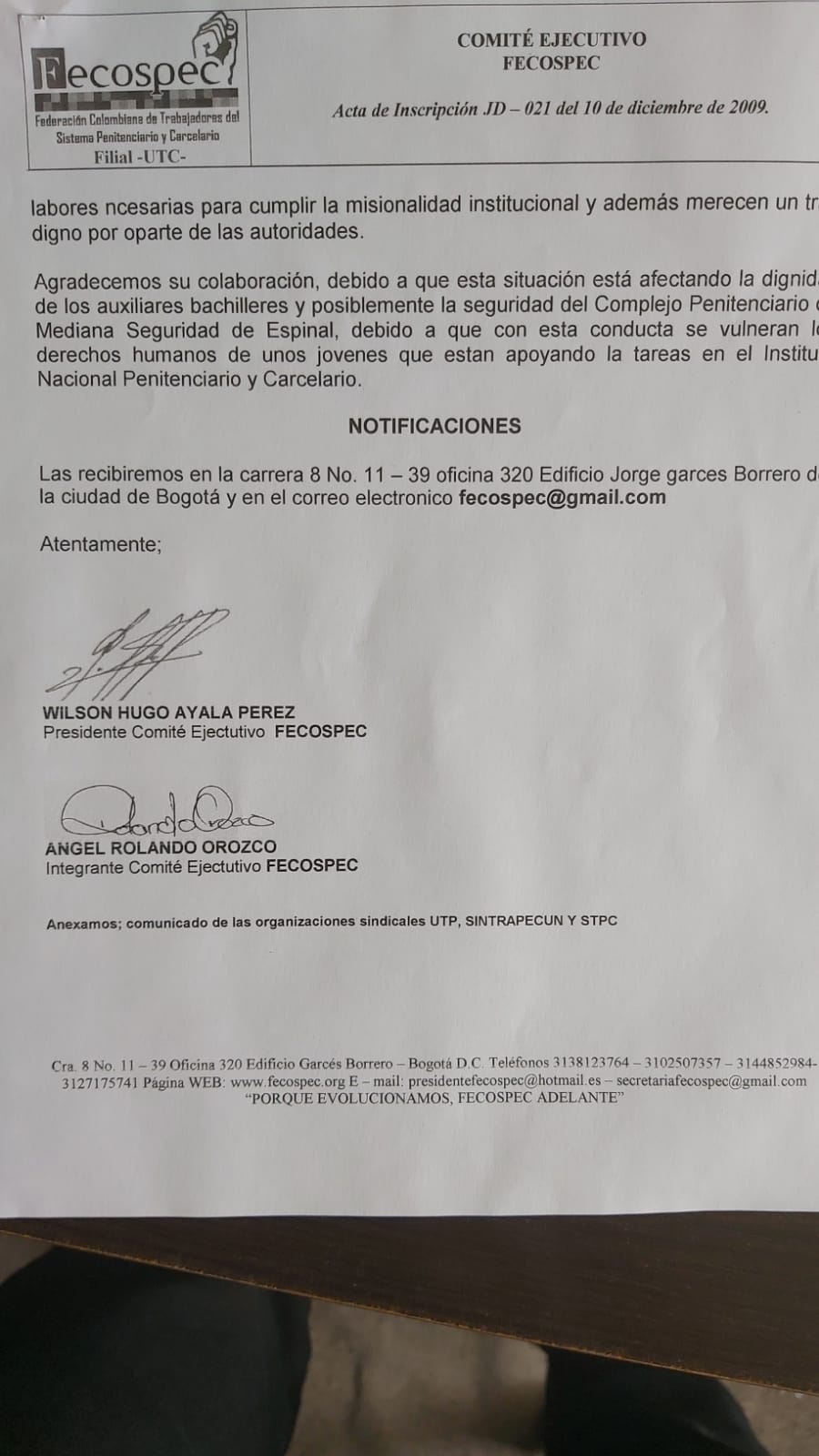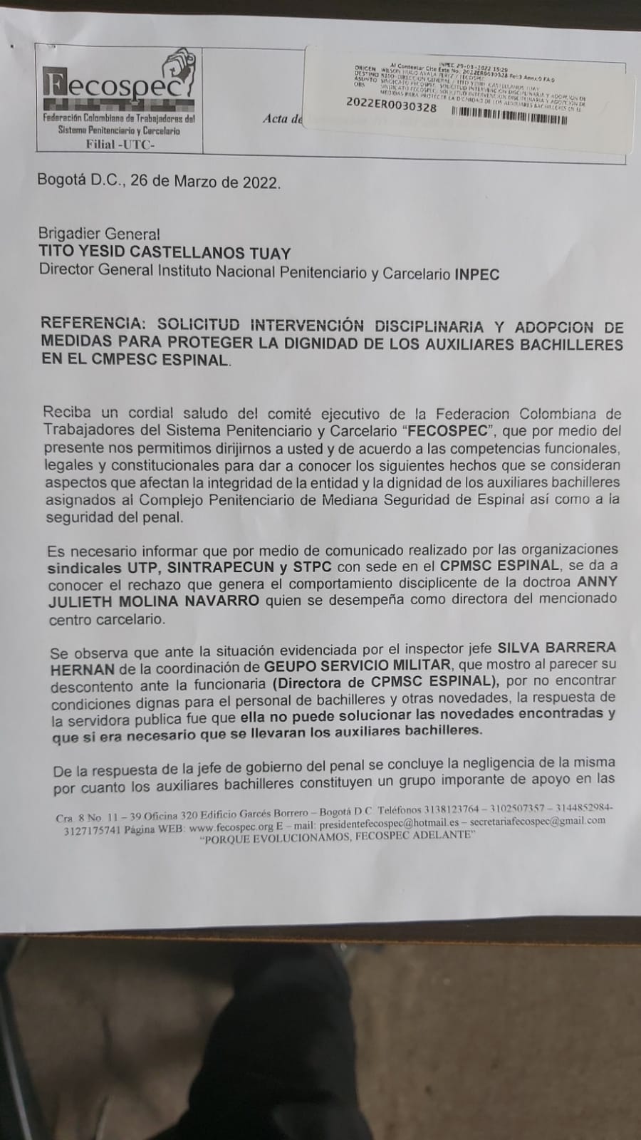 Solicitud elevada ante la Dirección General dando a conocer el rechazo por ciertas situaciones que se han presentado en el EPMSC Espinal. (ver documento abajo)