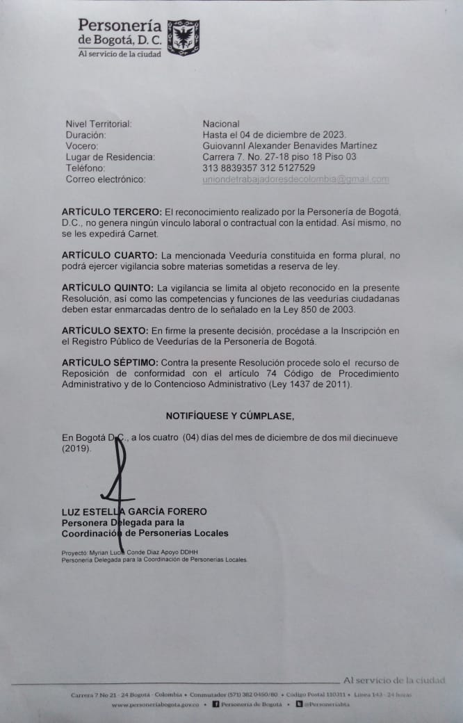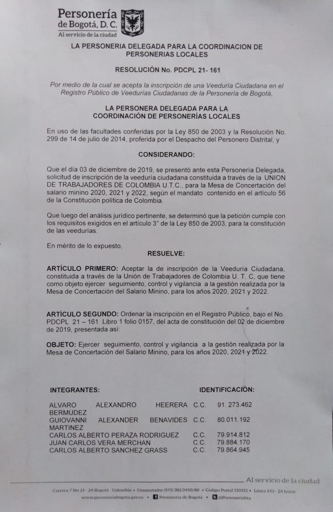 En el ánimo de fortalecer el ejercicio ciudadano de control a la gestión gubernamental y a las decisiones que afectan a los colombianos, la Confederación Unión de Trabajadores de Colombia UTC hemos constituido una veeduría ciudadana a la Mesa de Concertación del Salario Mínimo, para el 2020.(Ver Documento más Abajo)