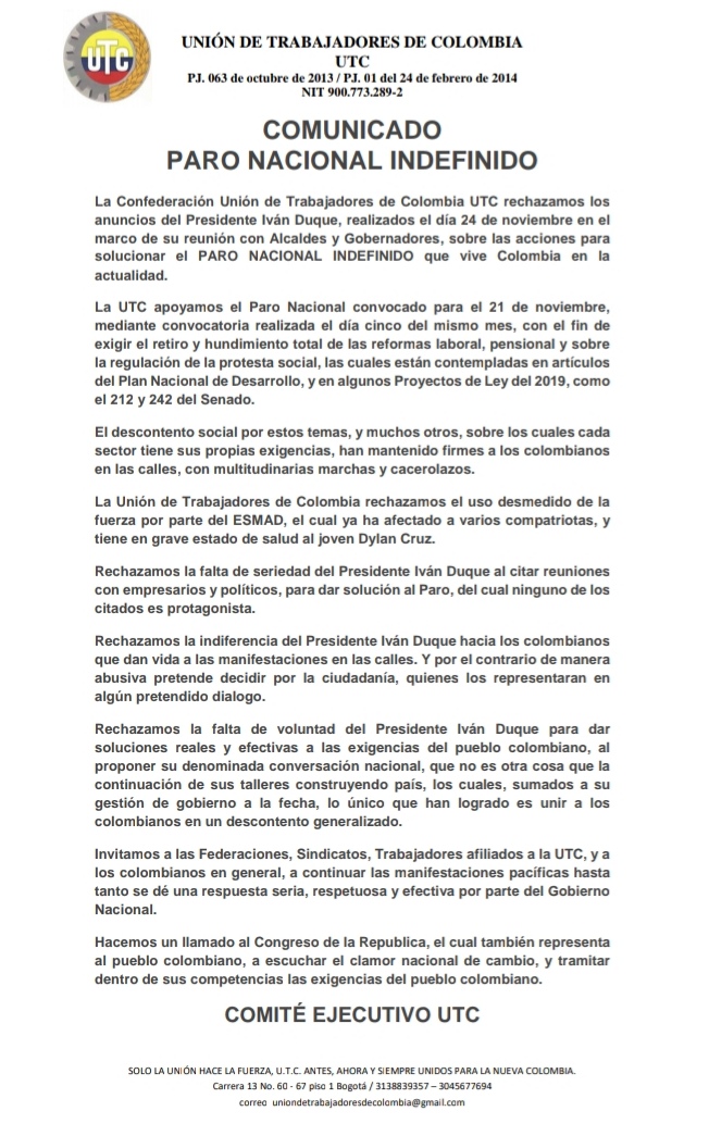 Comunicados UTC emite comunicado sobre el Paro Nacional Indefinido Por Comunicaciones Fecospec - noviembre 24, 2019 0 628 FacebookTwitterPinterestWhatsApp Rechazamos la falta de seriedad del Presidente Iván Duque al citar reuniones con empresarios y polìticos para dar solución al paro, del cual ninguno de los citados es protagonista.